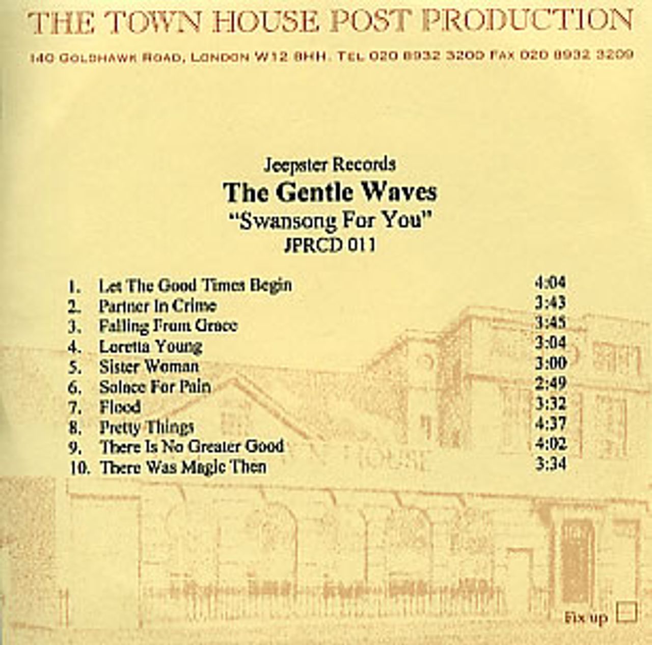THE GENTLE WAVES Swansong For You (Year 2000 UK Jeepster Records 10-track promo CD-R acetate including Let The Good Times Begin & Partner In Crime, custom printed disc + 'Town House' production company generic custom printed inlay)