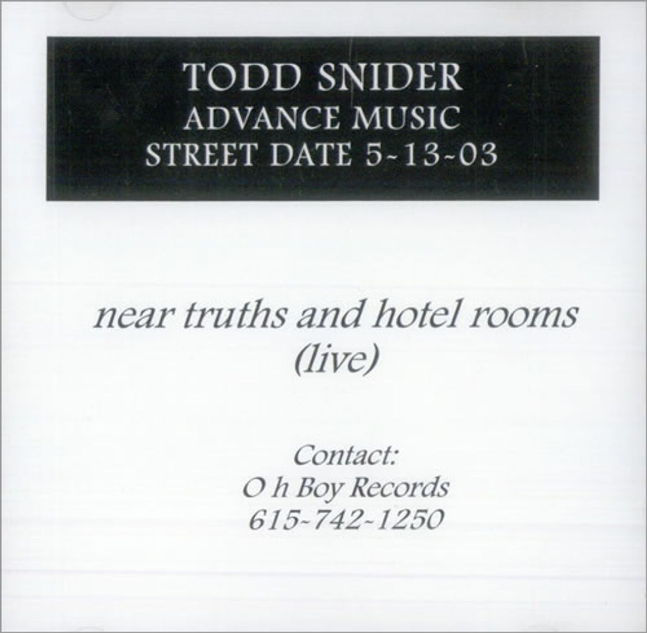 TODD SNIDER Near Truths And Hotel Rooms Live (2003 US 23-track Oh Boy Records advance promotional CD for the full album, custom printed disc complete with a custom title insert with the full tracklisting on the reverse OBR-024)