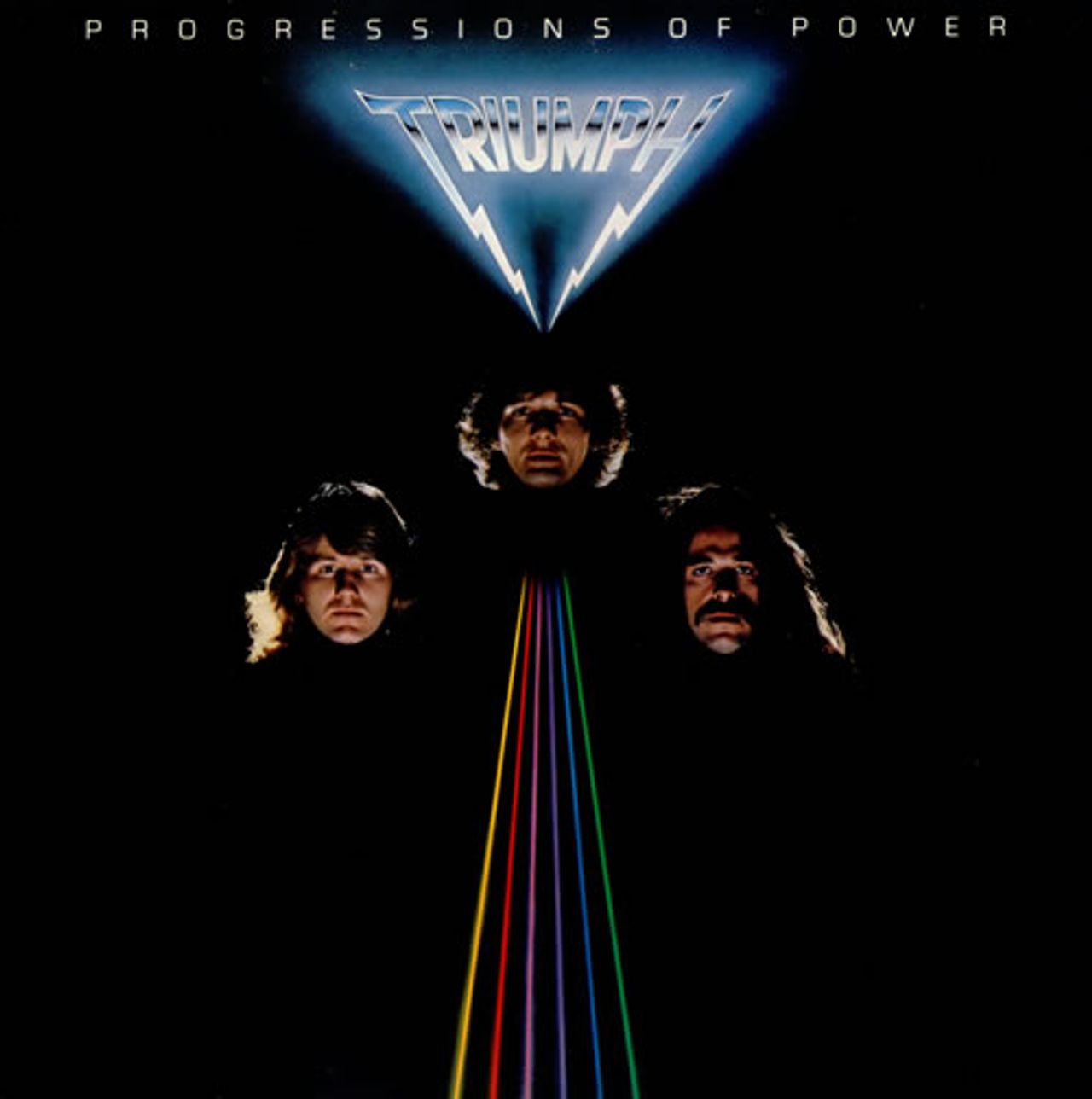 TRIUMPH Progressions Of Power (1980 UK 9-track vinyl LP from the Saga / Rush-esque rock power trio, including the single I Can Survive. The glossy picture sleeve shows a little shelfwear and comes with the lyric sheet and the vinyl remains inexcellent condition PL13524)