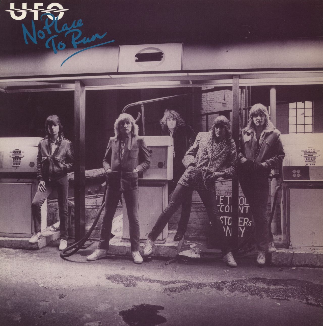 UFO No Place To Run (1980 UK 10-track vinyl LP, the first of the band's albums to feature Paul Chapman on guitar, replacing the legendary Michael Schenker and produced by another musical giant: George Martin [Beatles]. The purple tinted picture sleeve displays BLUE titles and has some light edge scuffing, however, the vinyl itself looks barely played)