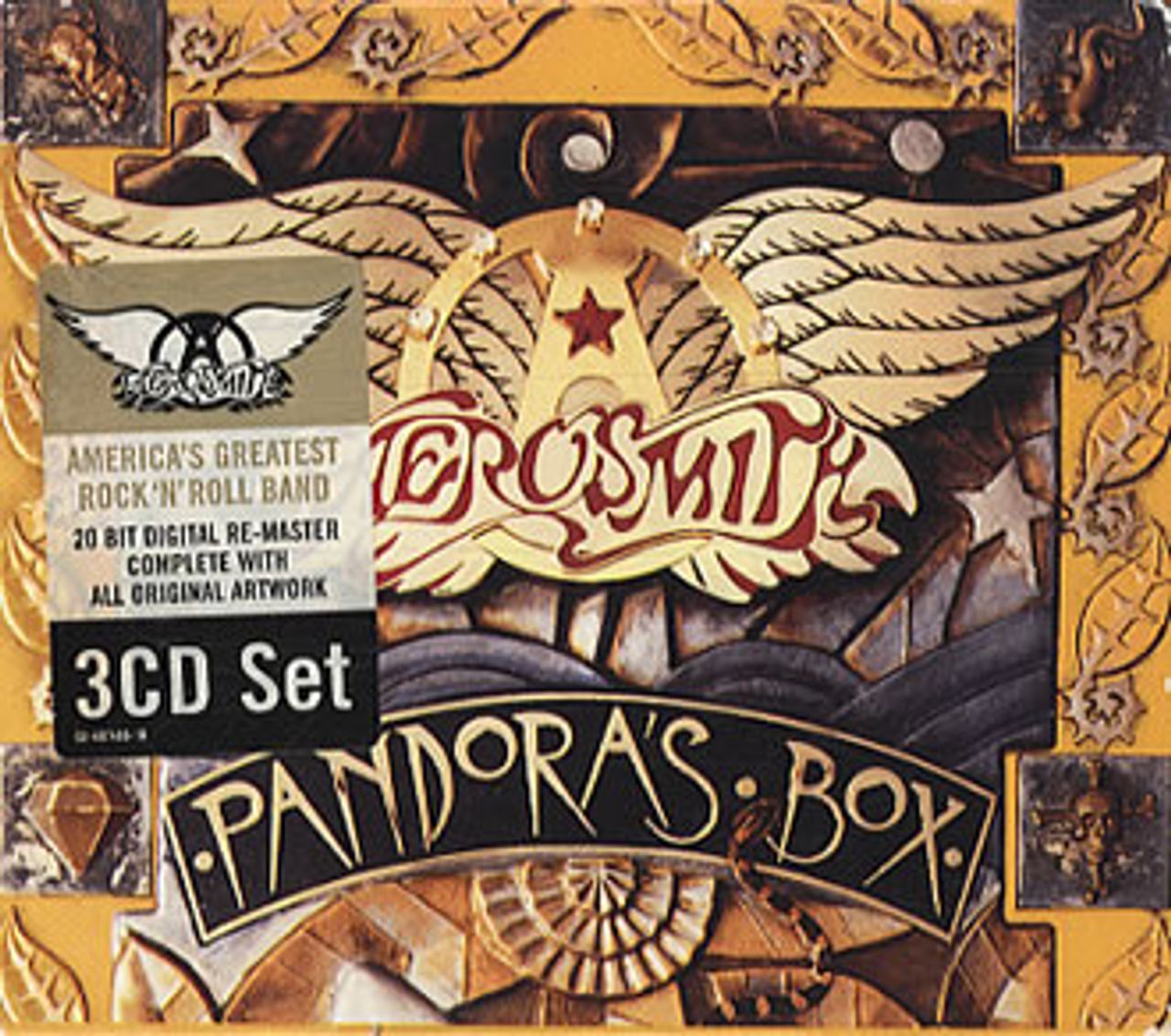 AEROSMITH Pandora's Box (1991 UK 52-track digitally remastered 3-CD album set comprising a superb collection of the legendary rockers' output for Columbia Records, recorded between 1972 and 1982, including a wealth of previously unreleased material, alternate takes, live recordings and remixes! The three discs are issued in a double jewel case picture sleeve with 38-page booklet with full biography, discography and info on each track - housed in a hype-stickered card picture slipcase)