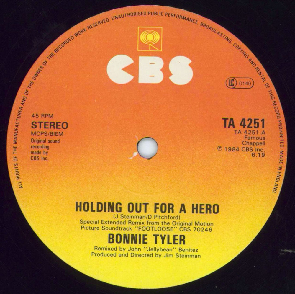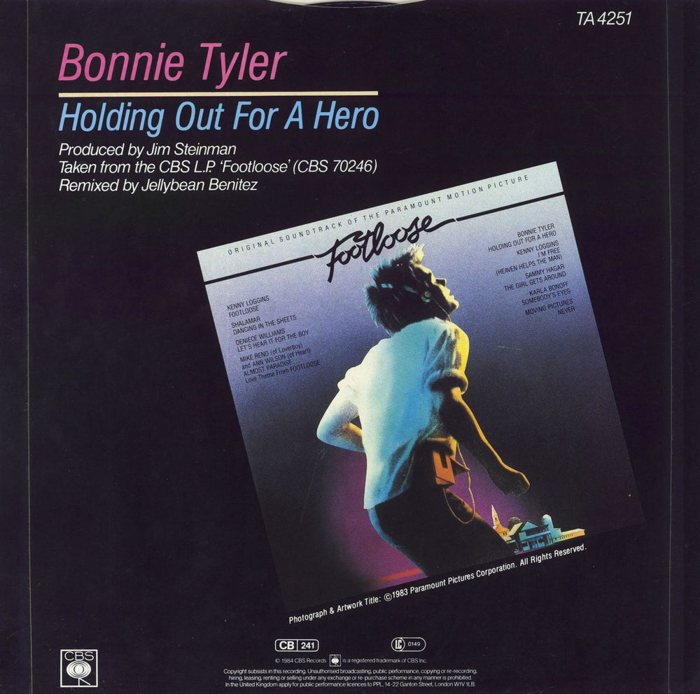 BONNIE TYLER Holding Out For A Hero (1984 UK 3-track 12" vinyl single, taken from the 'Footloose' motion picture soundtrack, including Extended Remix and Instrumental version plus Faster Than The Speed Of Night. The picture sleeve shows some wear and the vinyl shows some light play TA4251)