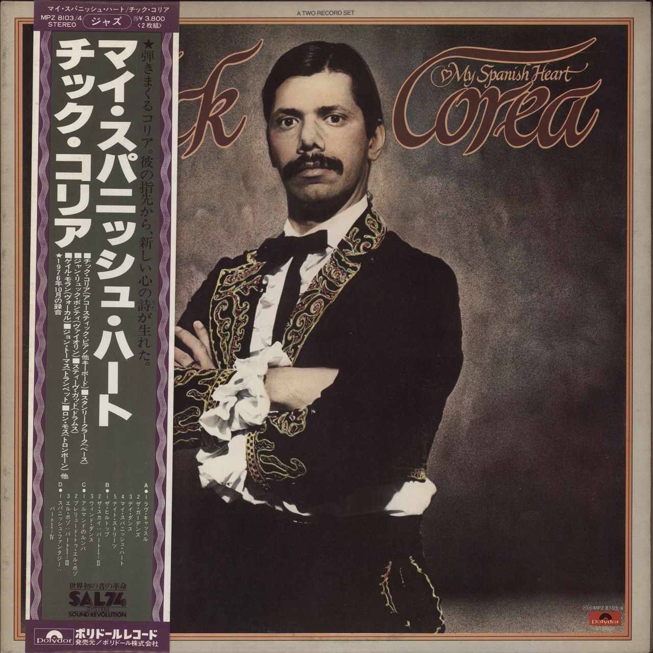 CHICK COREA My Spanish Heart (1976 Japanese sample 17-track double vinyl LP with custom white promotional labels - a great album from the legendary jazz pianist, offering jazz fusion mixed with the latin sound and has been hailed as one of Corea's best studio pieces; issued in a textured gatefold picture sleeve, complete with Japanese insert and obi-strip. The sleeve shows light wear and the vinyl is Near Mint MPZ8103/4)