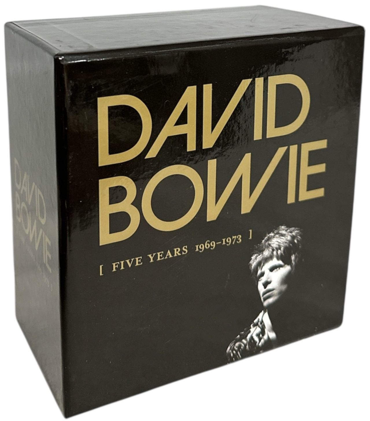 DAVID BOWIE Five Years 1969-1973 (2015 UK Deluxe Edition 12-CD set which contains an indepth overview of David's career from 1969 to 1973 including new digitally remastered versions of David Bowie [aka Space Oddity], The Man Who Sold the World, Hunky Dory, The Rise and Fall of Ziggy Stardust and the Spiders from Mars, Aladdin Sane and the last Spiders album with Bowie Pin Ups plus Live Santa Monica '72 and the last Ziggy Stardust show at the Hammersmith Odeon aswell as the exclusive new 'Re:Call 1' compilation of non-album singles, single versions and B-sides. Though without its fantastic hardback companion book, all twelve discs come in their own individual card wallet picture sleeves which are housed inside a stunning 5½" x 5½" x 3" black & gold picture box. The box show a few tiny signs of wear whilst the discs are all Near Mint DBX1)
