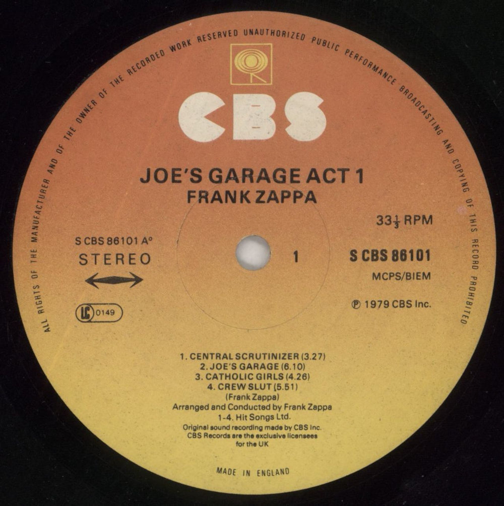 FRANK ZAPPA Joe's Garage Act I (1979 UK graduated orange label 8-track vinyl LP, the first act from the concept rock-opera packed with much guitar wizardry & perhaps even more comedy, sickly & slickly furnished on such delights as Wet T-ShirtNite, Catholic Girls & Why Does It Hurt When I Pee? Comes housed in an outrageous gatefold sleeve with the preamble to the cautionary story of Joe inside, with fold-out libretto. The sleeve shows some scuffing and edgewear. Whilst the vinyl has just a handful of cosmetic hairlines and light signs of play CBS86101)