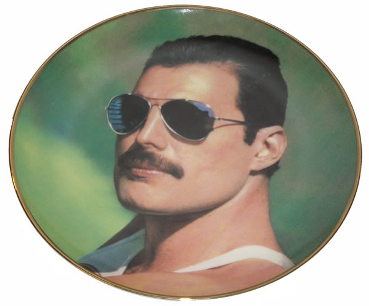 FREDDIE MERCURY Mr Bad Guy (UK Danbury Mint special edition 8" diameter commemorative fine porcelain plate rimmed with 22 carat gold, featuring a superb colour portrait of Freddie with facsimile signature and silhouette motif on the reverse. Issued as part of the Freddie Mercury Collection, these plates were a limited subscription issue and are now only available via the collectors market - complete with the original circular certificate of authenticity, seriel number 1947!)