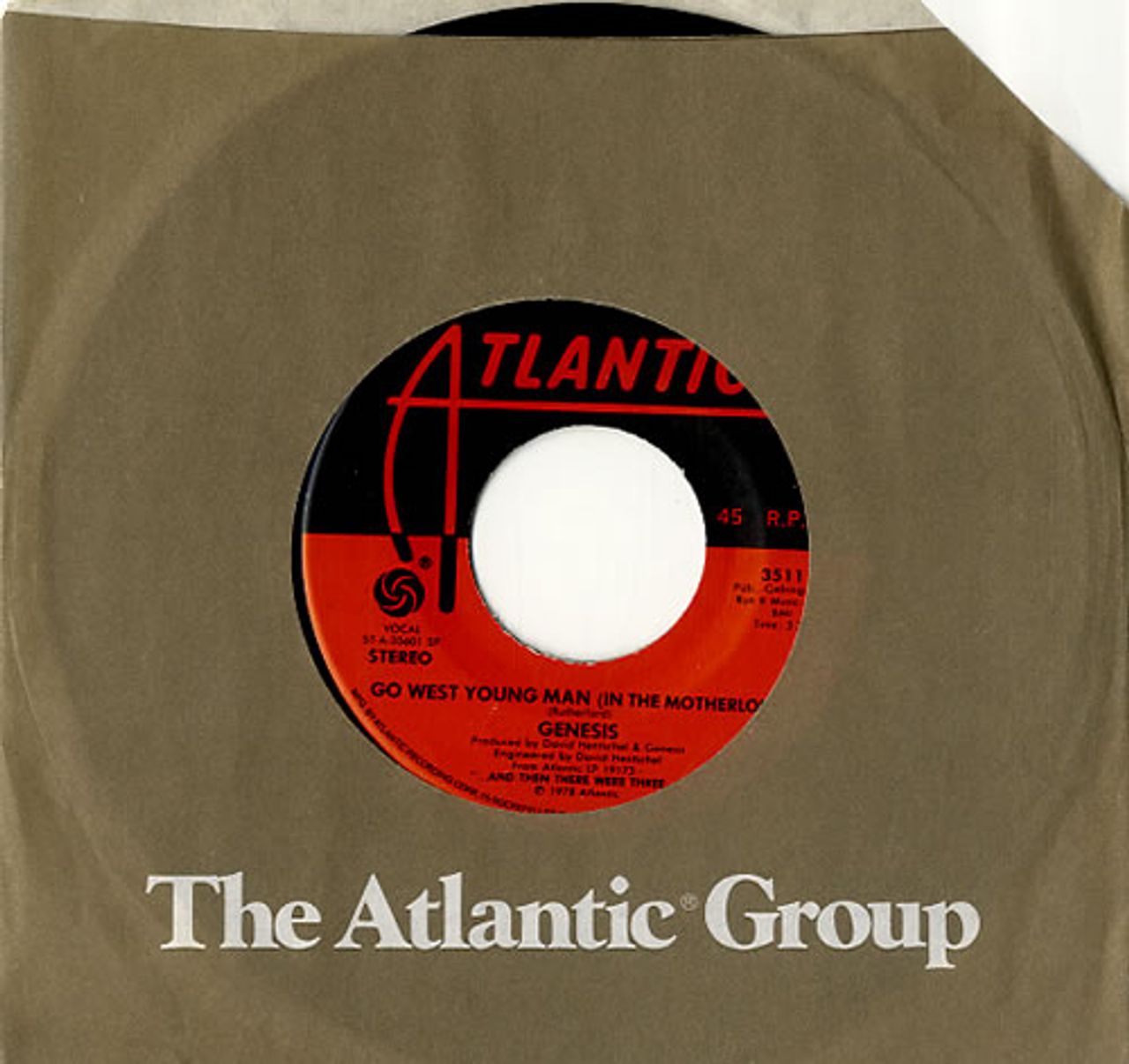 GENESIS Go West Young Man (In The Motherlode) (Scarce 1978 US wide centred 7" vinyl single, also featuring Scenes From A Night's Dream, record company die cut paper sleeve)