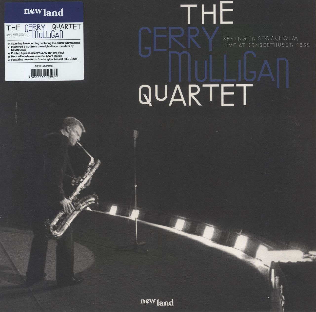 GERRY MULLIGAN Spring In Stockholm: Live at Konserthuset, 1959 (2024 UK 7-track LP, previously unreleased archival recordings featuring Gerry Mulligan on baritone sax and piano, Art Farmer on trumpet, Bill Crow on bass and Dave Bailey on drums. Remastered from the original master tapes and pressed on audiophile quality 180gram black vinyl. Housed in a single pocket picture sleeve within a hype-stickered resealable outer bag. Mint & unplayed NEWLAND009)
