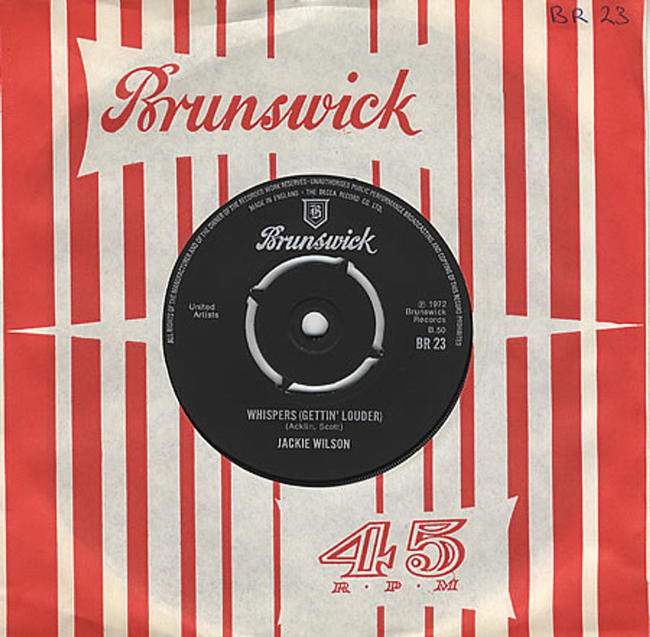 JACKIE WILSON Whispers / Reet Petite (Original 1972 UK 7" vinyl single with an intact four prong centre, also including Whispers (Gettin' Louder), in a Brunswick company die-cut paper sleeve BR23)