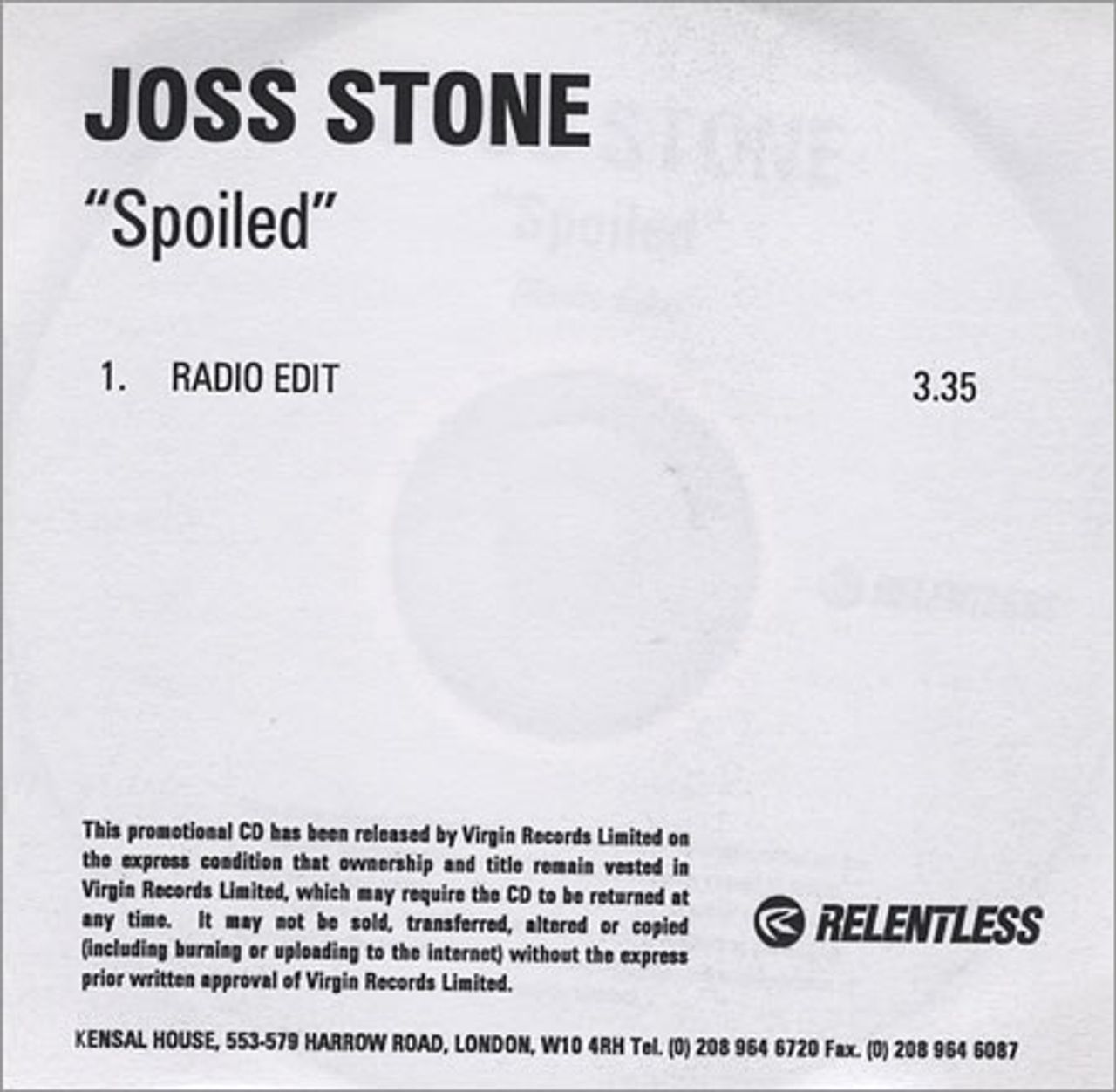 JOSS STONE Spolied (2004 UK official Relentless/Virgin Records release 1-track [3:35 Radio Edit] promotional only CD-R acetate issued exclusively to radio stations and reviewers, custom printed disc and title/tracklisting inlay)