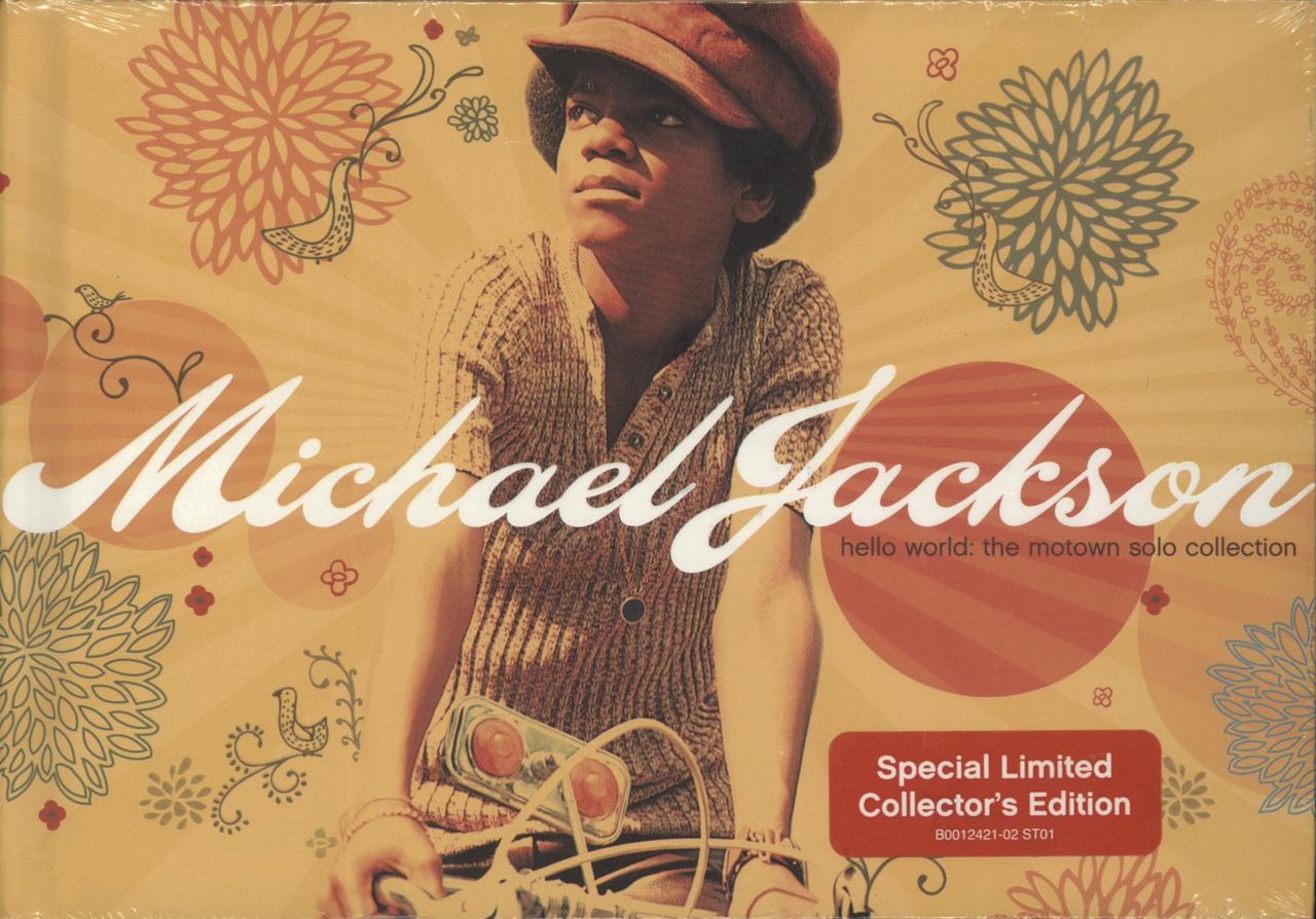 MICHAEL JACKSON Hello World: The Motown Solo Collection (2009 UK issue 71-track 3-CD album set - At the height of the Jackson 5 mania in 1970-71, a solo career for young Michael was not a given. But when Donny Osmond went solo while staying inthe Osmonds family group, Michael went solo as well, and was given material that made him sound more mature. 'Hello World' comprises Michael's 4 studio albums recorded for Motown ['Got To Be There', 'Ben', 'Music & Me' and 'Forever, Michael']; plus the vault master collections 'Farewell My Summer Love' & 'Looking Back To Yesterday'. All presented in a hard-backed 8" x 5.5" package factory sealed with an introductory essay by Motown's Suzee Ikeda, a main essay by Mark Anthony Neal, pages of annotations, rare photos and repros of the LP jackets!)