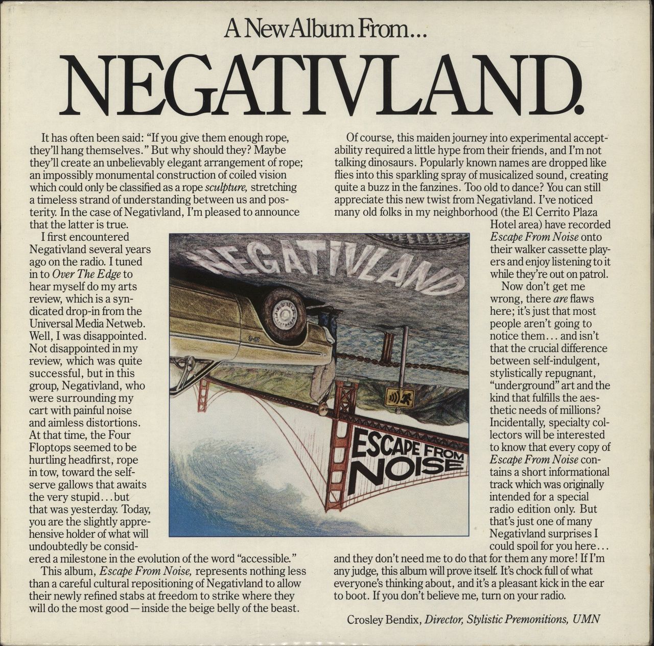 NEGATIVLAND Escape From Noise (1987 Swiss 18-track vinyl LP, houed in a single pocket picture sleeve including a 20-page booklet and rare 'Car Bomb' bumper sticker. Both sleeve and vinyl remain in near mint condition)