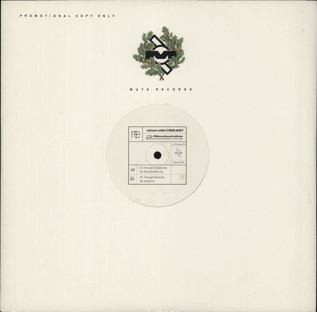 NITZER EBB I Thought (1995 UK 4-track 12" promo vinyl Single Mix and Final Sin, as well as Friend [Brittle Mix] and Beats Me, Mute company die-cut sleeve P12MUTE164)
