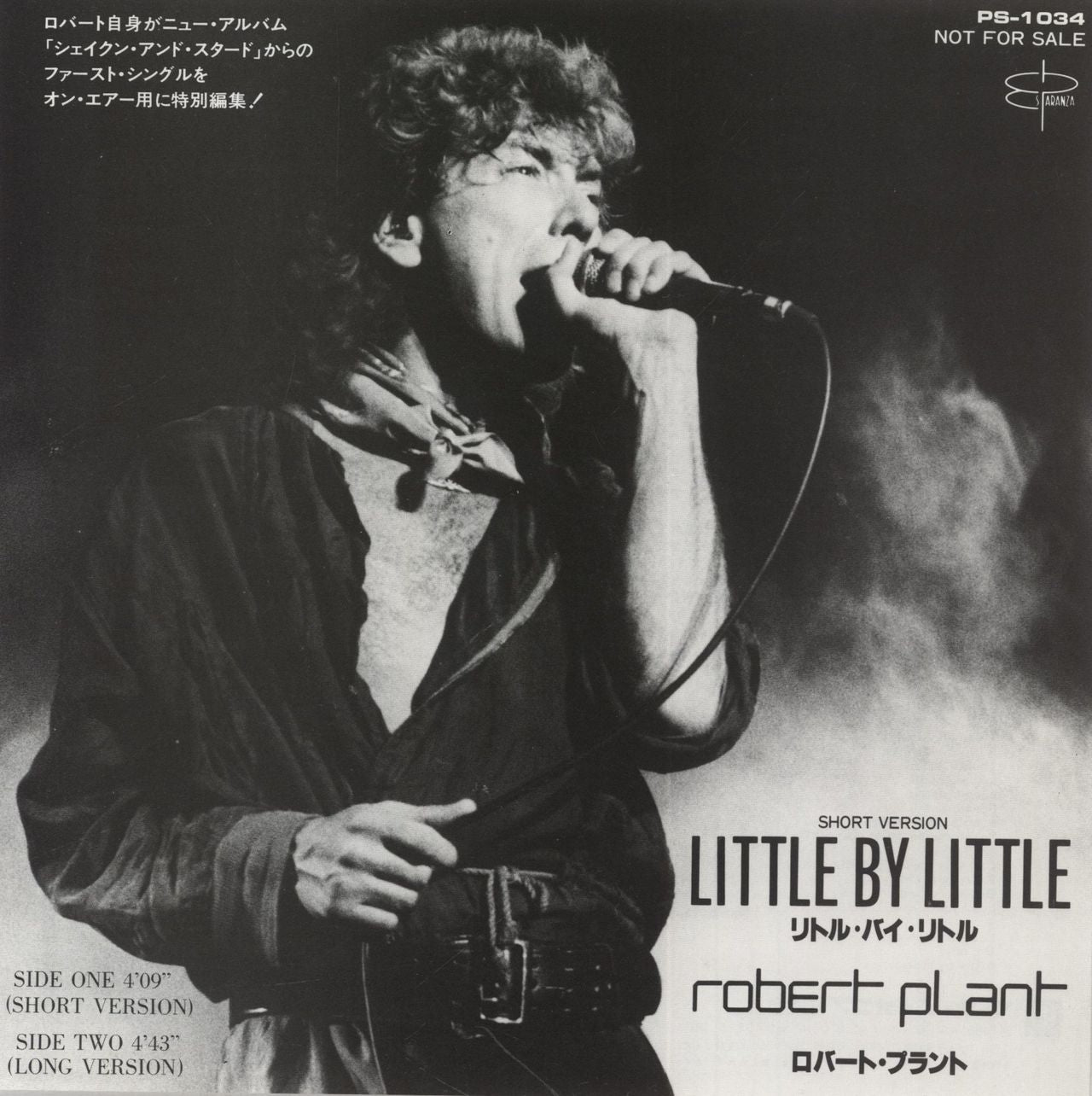 ROBERT PLANT Little By Little (Rare 1985 Japanese 2-track Esparanza label vinyl 7" with a wide centre and has 'Made by Warner-Pioneer' text on the label, features the Short and Long versions. Housed in a record label company paper sleeve and comes with a unique promo picture insert different to any other issue of the single, featuring a black & white image of Robert standing singing into a microphone and dry ice, on the back is printed the lyrics in English and Japanese along with'Shaken 'n' Stirred' album arwork and smaller image from the front all in black & white. The sleeve & vinyl are Near Mint PS-1034)