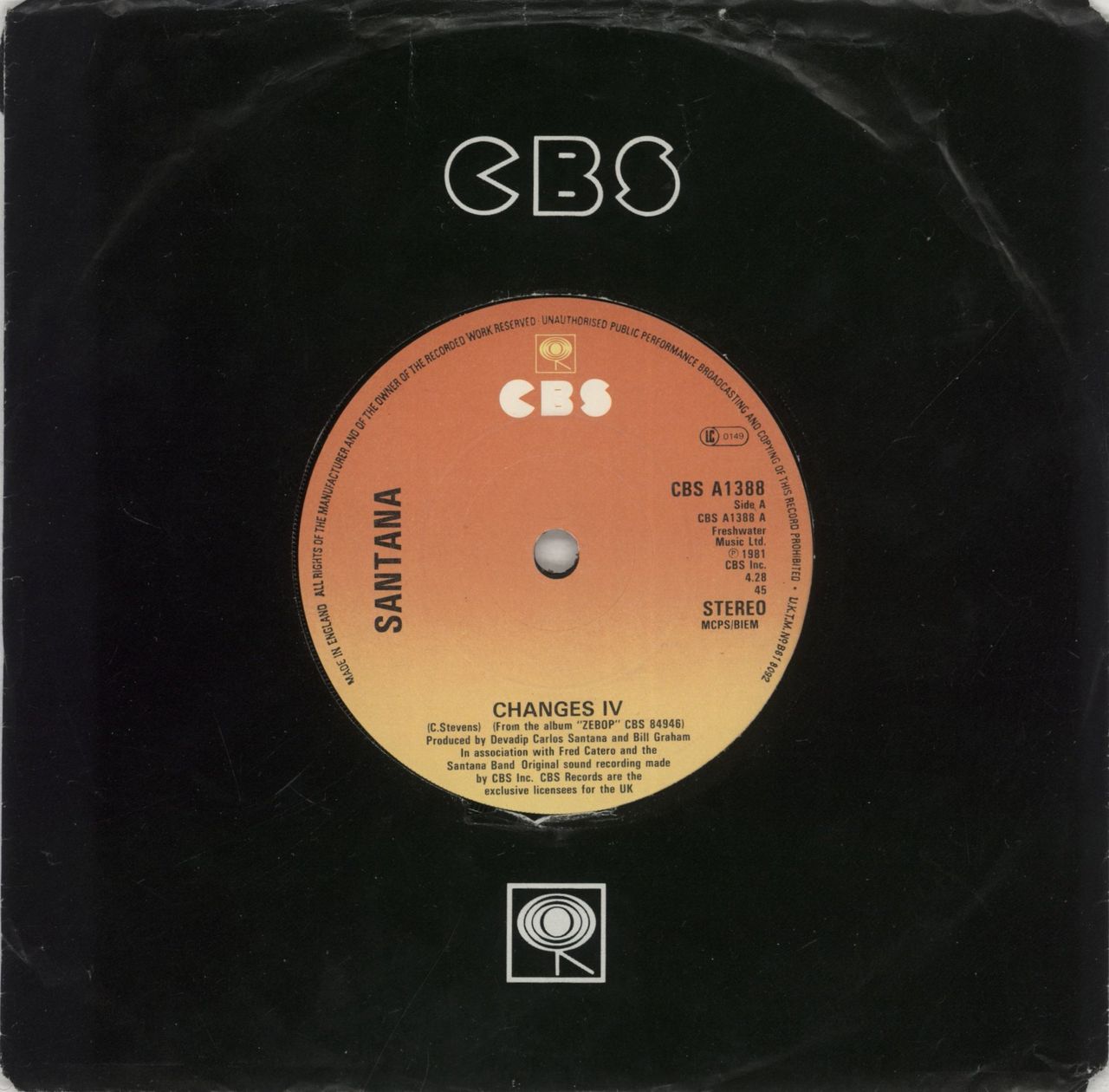 SANTANA Changes IV (1981 UK 7" vinyl single with solid centre, includes American Gypsy, CBS company die-cut sleeve CBSA1388)