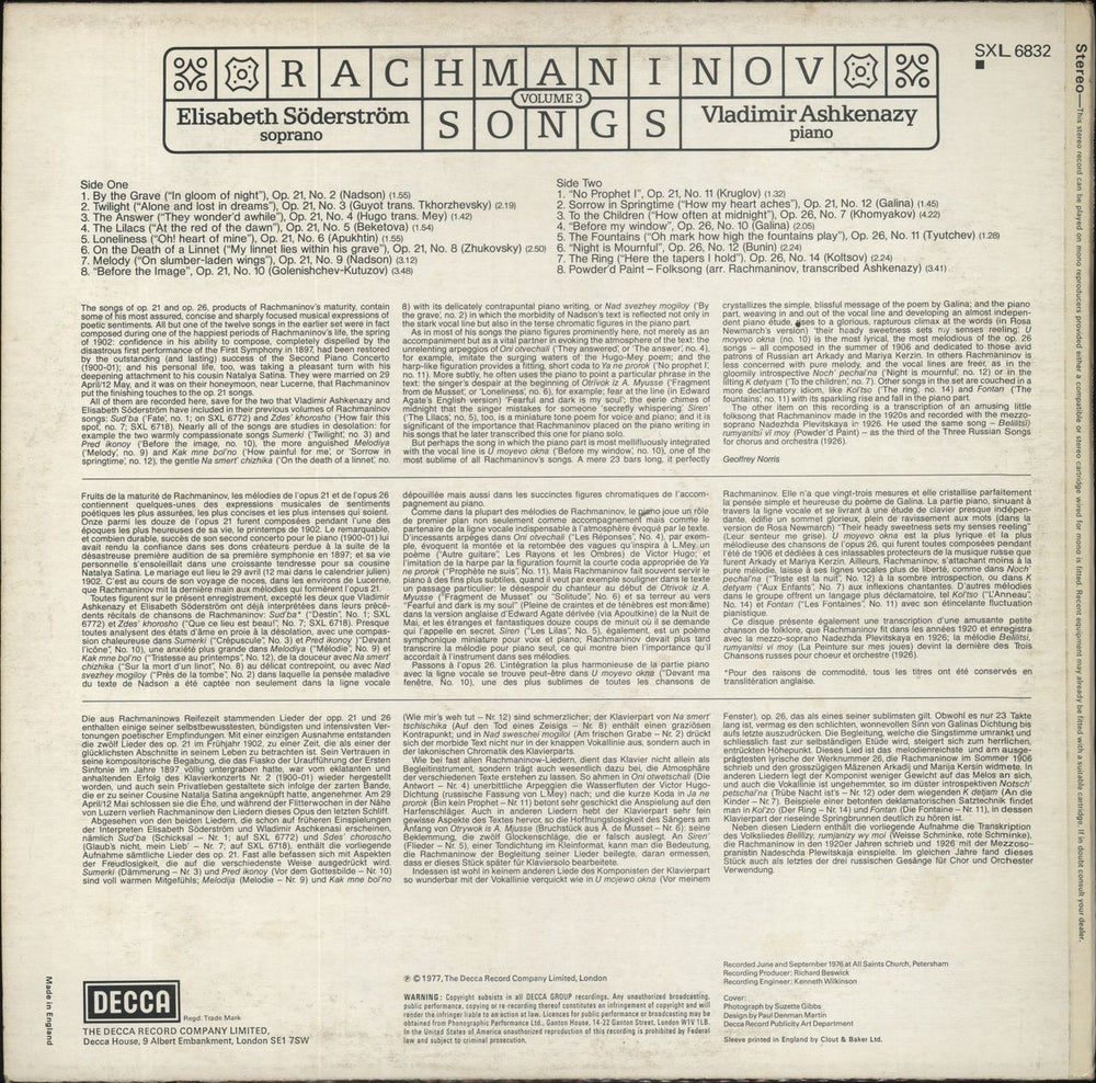 ELISABETH SODERSTROM / VLADIMIR ASHKENAZY Rachmaninov Songs - Volume 3 (1977 UK factory sample for the 16-track vinyl LP on the pink 'Not For Sale' label, commercial picture sleeve. The sleeve shows light wear and the vinyl appears barely played SXL6832)