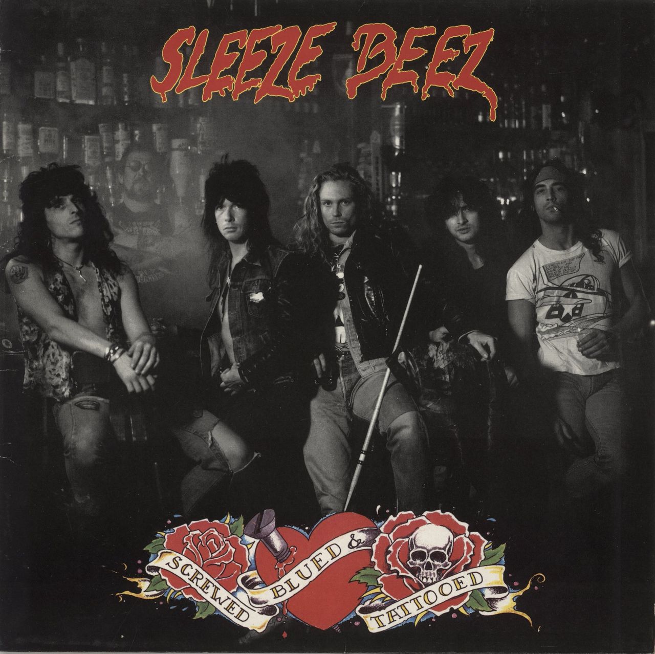 SLEEZE BEEZ Screwed Blued & Tatooed (1990 German 11-track vinyl LP featuring the second album from the Dutch glam metal band which peaked at number 115 on the Billboard 200 album chart, including 'Stranger Than Paradise' which went on tobe abig hit on MTV and 'Girls Girls, Nasty Nasty', glossy picture sleeve with the lyric inner. The sleeve shows some light age related wear and the vinyl presents a few light cosmetic scuffs, none of which can be felt to the touch and would not have any real impact on play)