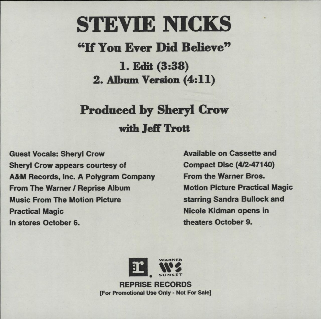 STEVIE NICKS If You Ever Did Believe (1998 US Reprise label 2-track promotional only CD-R produced by and with vocals by Sheryl Crow. Issued to radio only as a custom printed disc wth title inlay)