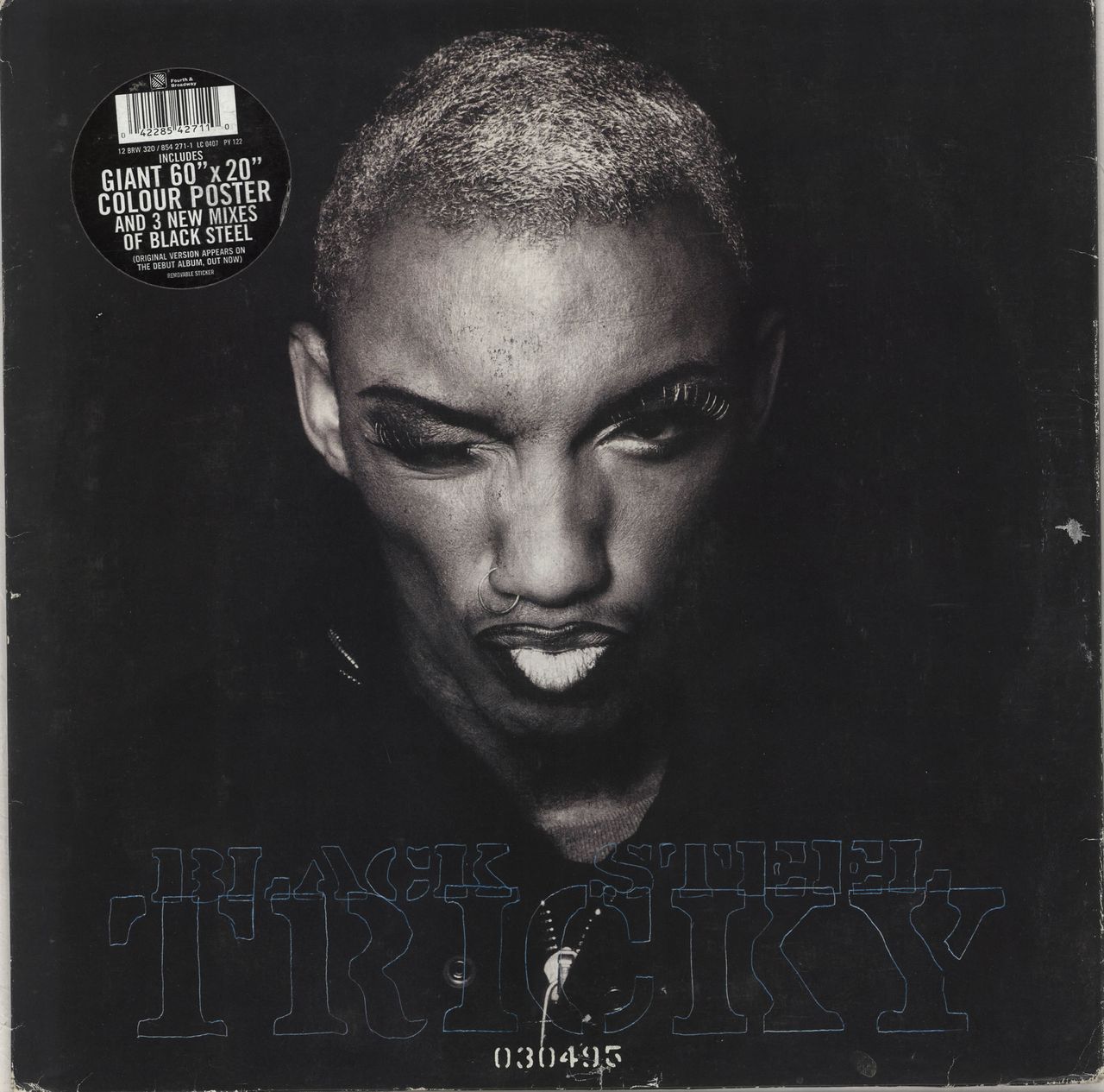 TRICKY Black Steel (1995 UK 4-track 12" vinyl single, featuring the Album, Live, Been Caught Steeling & In The Draw mixes, housed in a picture sleeve with the hype sticker & giant 60"x20" colour poster. The sleeve shows some moderate creasingto the edges, whilst the vinyl appears barely played, thus remaining in Near Mint condition 12BRW320)