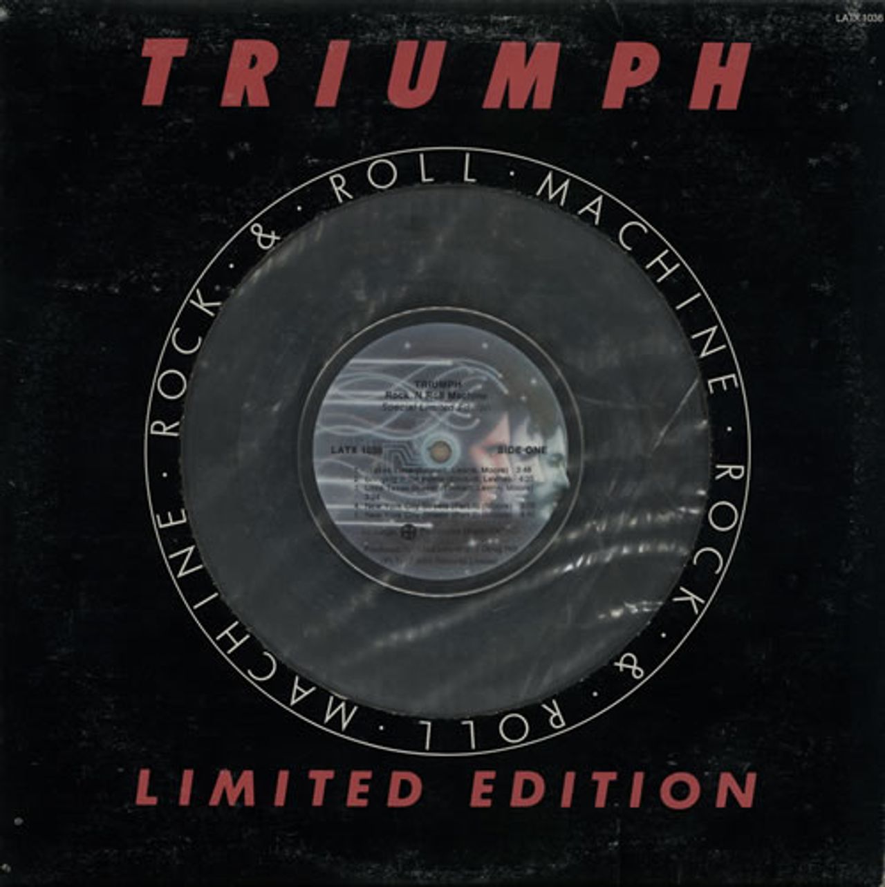 TRIUMPH Rock & Roll Machine (1977 Canadian only limited edition issue 7-track Silver Vinyl LP, 2nd album from the Canadian heavy rock trio akin to fellow countrymen Saga and Rush including the 3 part suite TheCity and featuring a cover of Rocky Mountain Way by Joe Walsh. Housed in a front die-cut picture sleeve with live shots on the reverse, the sleeve is displaying some minor storage wear with scuiffing and a couple of small discreet pin holes, the vinyl has onlyafew surface marks but plays without any problems, overall an excellent copy of this 35 year old pressing LAT1036)