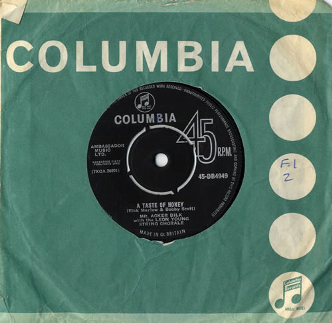 ACKER BILK A Taste Of Honey (1963 UK 7" vinyl single with intact four prong centre, also including Evening Shadows, Columbia company die cut paper sleeve. The vinyl shows only some light hairlines which do not affect play 45-DB4949)