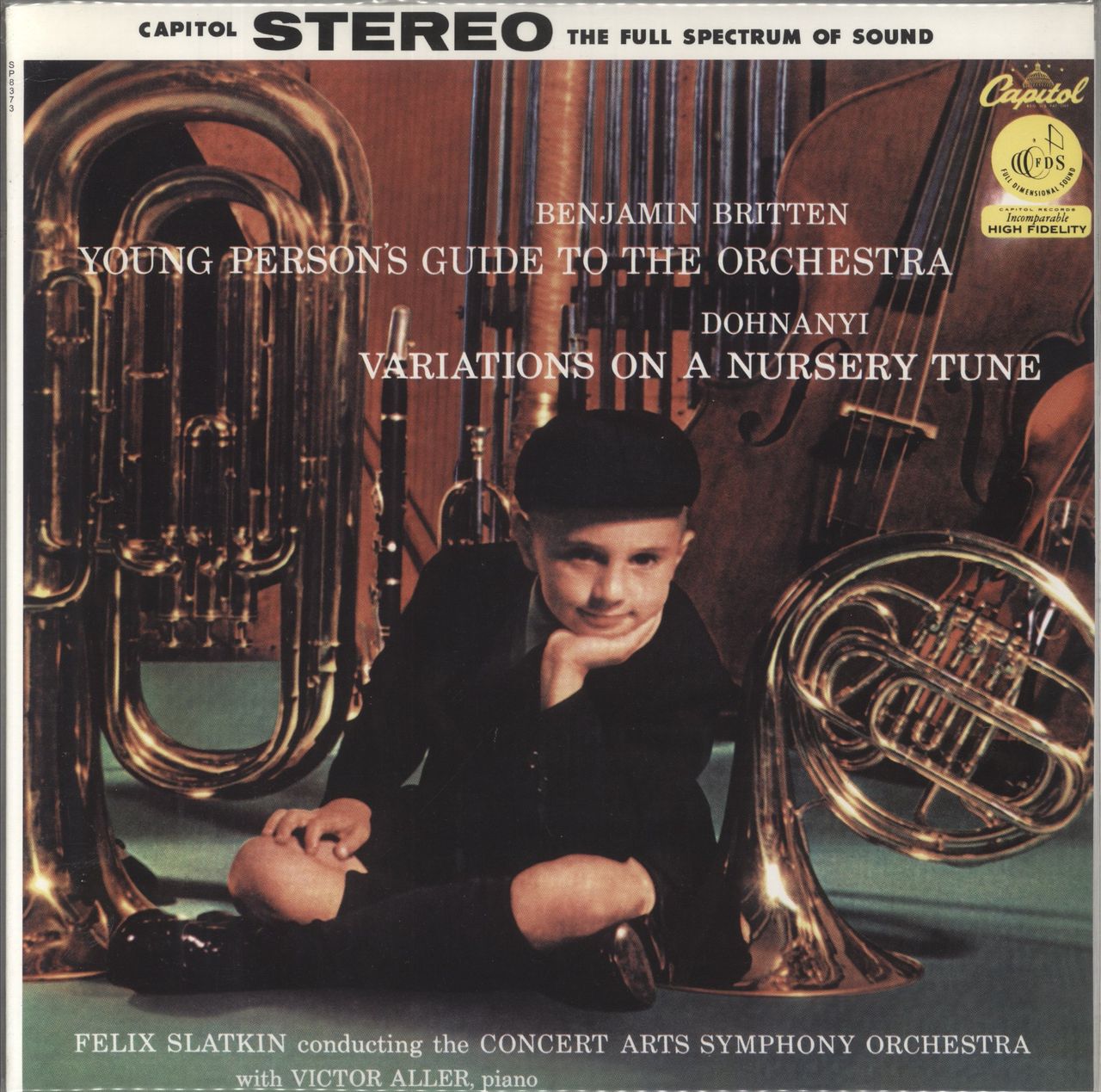 FELIX SLATKIN conducts THE CONCERT ARTS SYMPHONY ORCHESTRA Britten: Young Person's Guide To The Orchestra (Limited Edition 2002 US Cisco Music Exclusive Stereo LP pressed on 180gram Vinyl, including a stunning performance of Dohnányi'sVariations On A Nursery Tune, first released on Capitol in 1957 & expertly remastered by Kevin Gray at AcousTech. Comes housed in a deluxe replica picture sleeve, still in the clear reseal with the gold company sticker on the back. Near Mint SP8373)