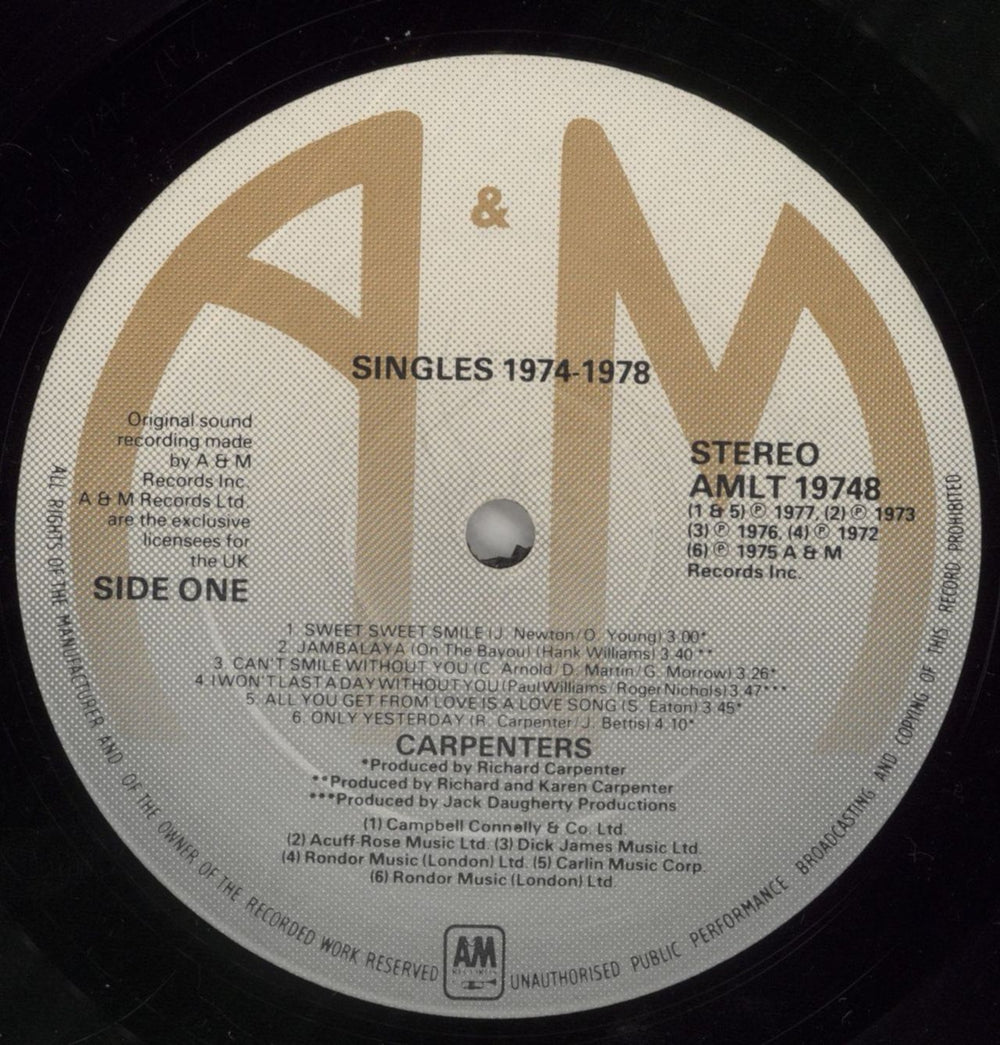 CARPENTERS The Singles 1974-1978 (1978 UK 12-track LP compilation, housed in the original gold metallic embossed sleeve complete with the full colour discography inner. The sleeve & the vinyl remain in Excellent condition AMLT19748)