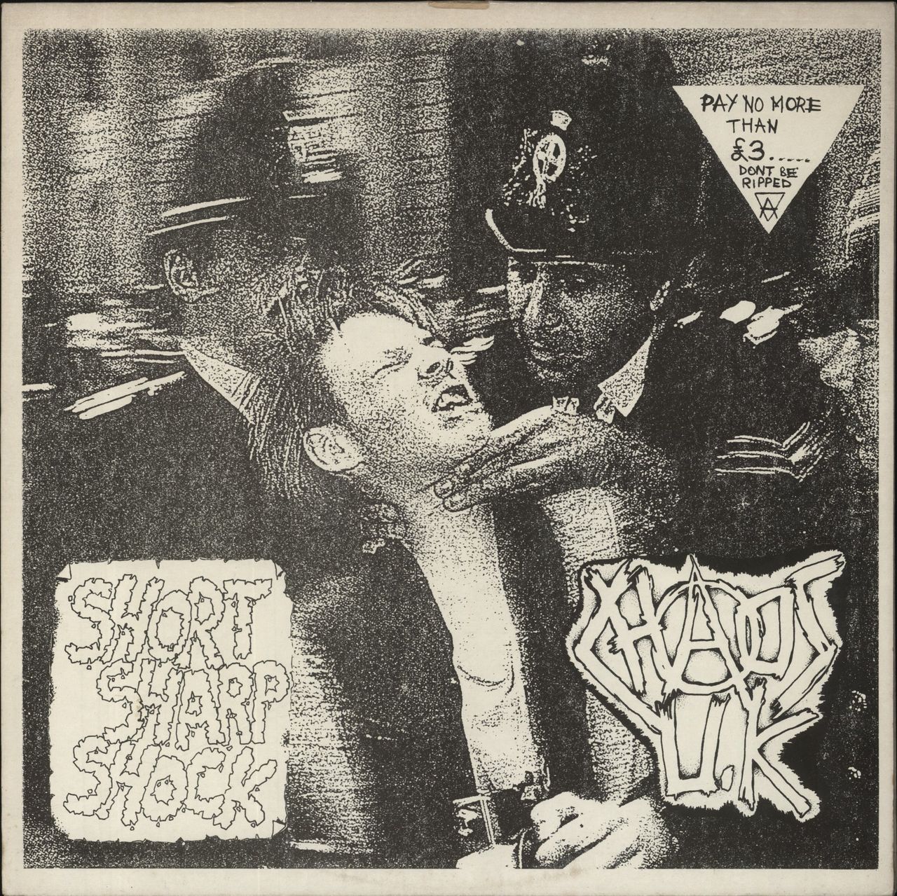 CHAOS U.K. Short Sharp Shock (1984 UK first issue 9-track vinyl LP by the UK hardcore punk outfit, housed in the black & white £3.00 price-flash picture sleeve. The sleeve has a small seam split in the top edge and only minor wear, whilst the vinyl appears barely played GURT1)