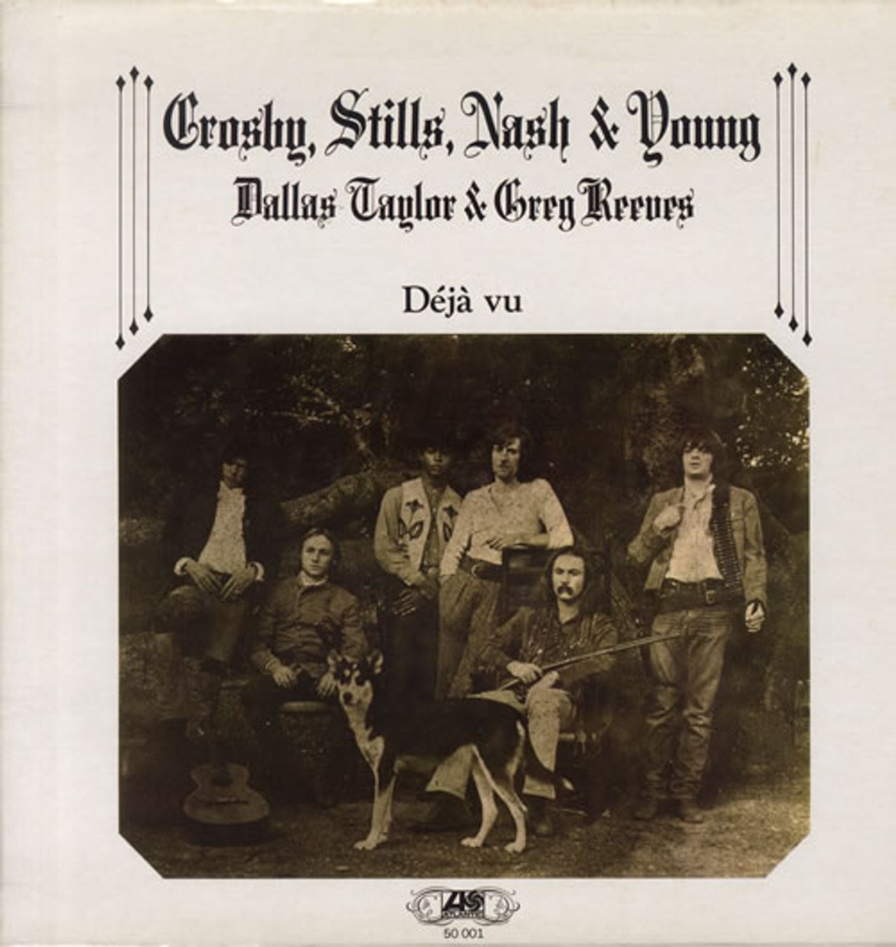 CROSBY, STILLS, NASH & YOUNG Déjà Vu (Mid 70s French 10-track vinyl LP with the green & orange Atlantic label, front laminated gatefold picture sleeve with white surround and sleevenotes in French printed on the back. The sleeve displays somelight general wear & signs of age, and has a small nick on the back open edge, whilst the vinyl remains excellent with only light signs of play)