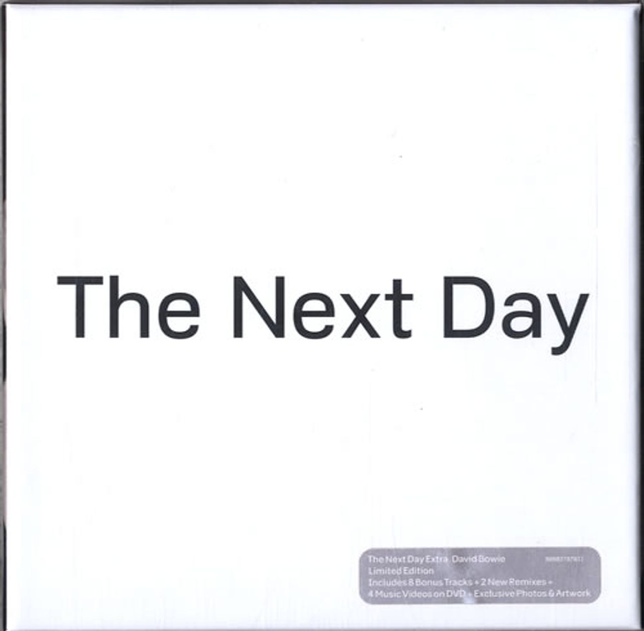 DAVID BOWIE The Next Day Extra (Sealed 2013 UK Collector's Edition three disc [2CD/1DVD] set, consisting of the 14-track CD album featuring the singles Where Are We Now?, The Stars [Are Out Tonight], The Next Day, Valentine's Day, LoveIs Lost, alongside a 10-track Bonus CD including eight bonus recordings & two new remixes, plus a Bonus Region 0 NTSC DVD containing four music videos. All three discs are housed together within a sealed & stickered5" square black & white titled box [with a lift-off lid] with exclusive photos & artwork)