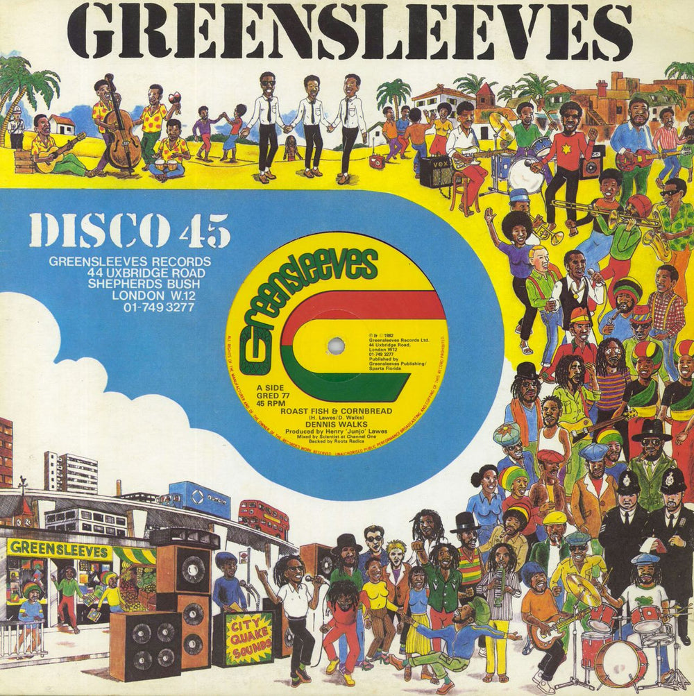 DENNIS WALKS Roast Fish & Cornbread / Wicked She Wicked (1982 UK 2-track 12" vinyl single, Greensleeves company die-cut sleeve. The labels are clean and the vinyl is VG+ with light axial wear GRED77)
