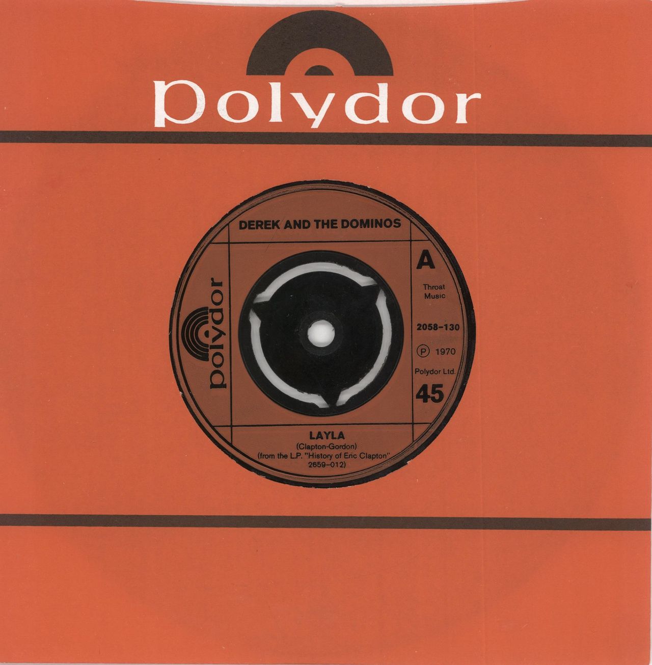 DEREK AND THE DOMINOS Layla (1972 UK 7" injection moulded vinyl single with intact tri-centre, also including Bell Bottom Blues, Polydor die-cut paper sleeve. The vinyl shows just light signs of play)