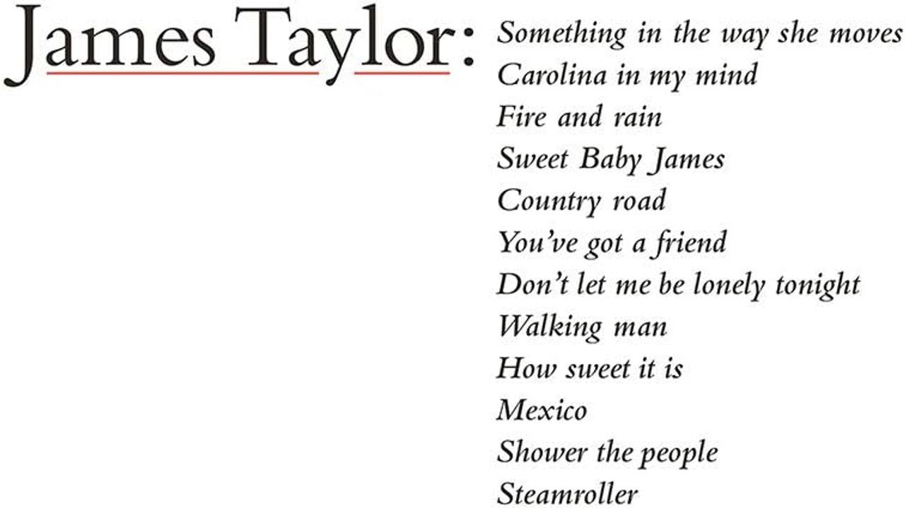 · Features James Taylor's most beloved classics, including Fire and Rain, Sweet Baby James, You've Got a Friend and more