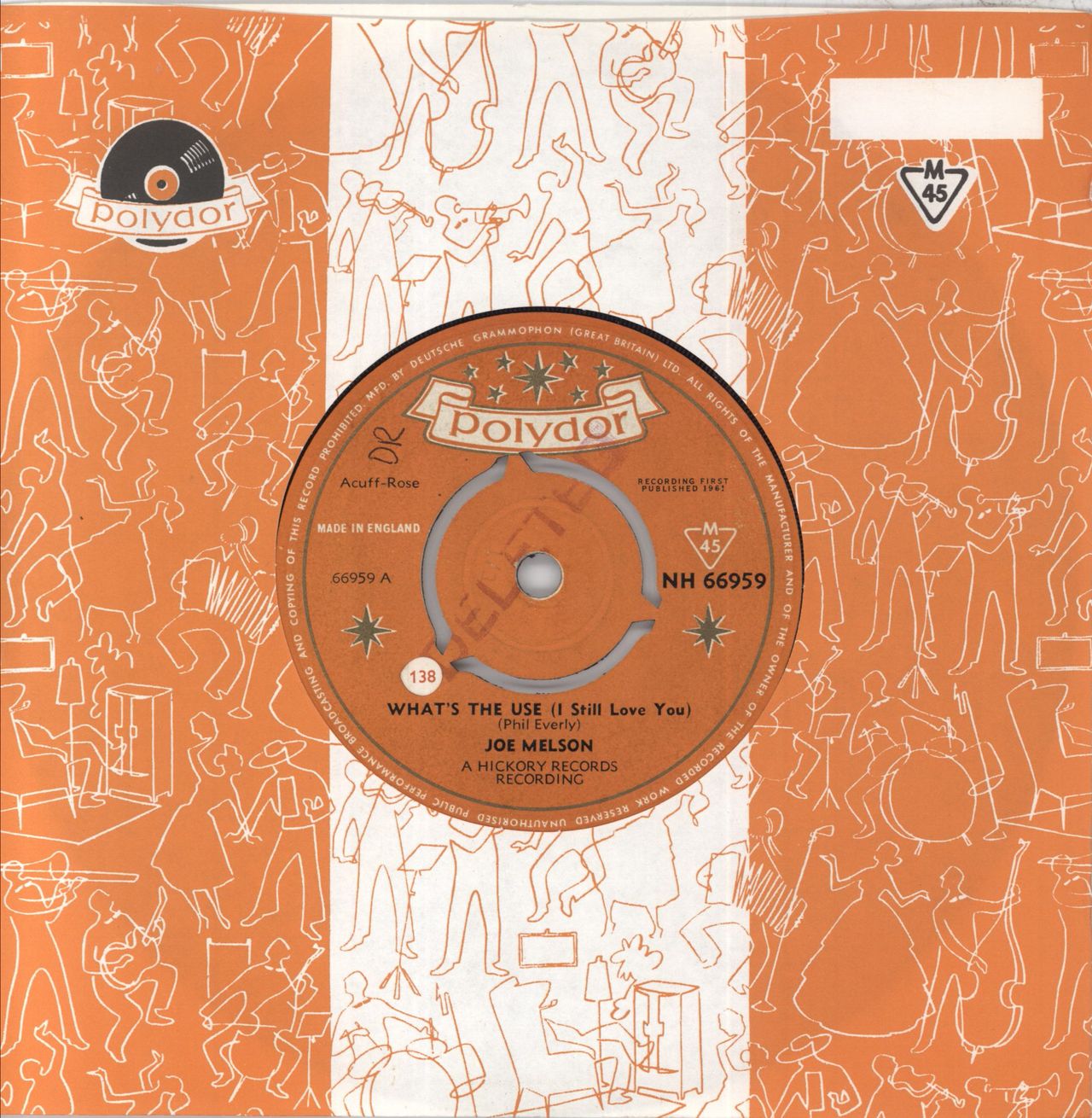JOE MELSON What's The Use (I Still Love You) (Rare 1961 UK 7" vinyl single with intact three prong centre, also featuring Oh Yeah!, Polydor logo die cut paper sleeve. There is a deleted stamp across the labels but the vinyl remains in superb condition with few signs of play NH66959)