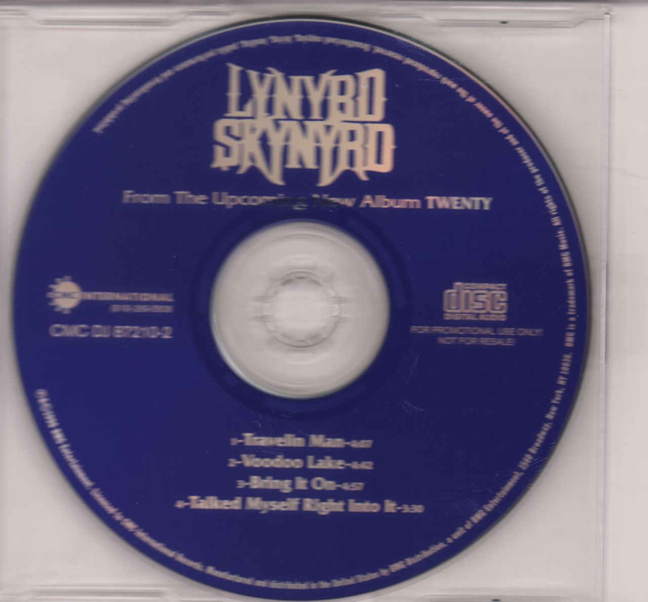 LYNYRD SKYNYRD Album Sampler (1996 CMC US 4-track promotional only 'Twenty' Album Sampler CD, includes the tracks Travelin Man, Voodoo Lake, Bring It On and Talked Myself Right Into It. Custom blue printed disc with silver text including tracklisting CMCDJ87210-2)