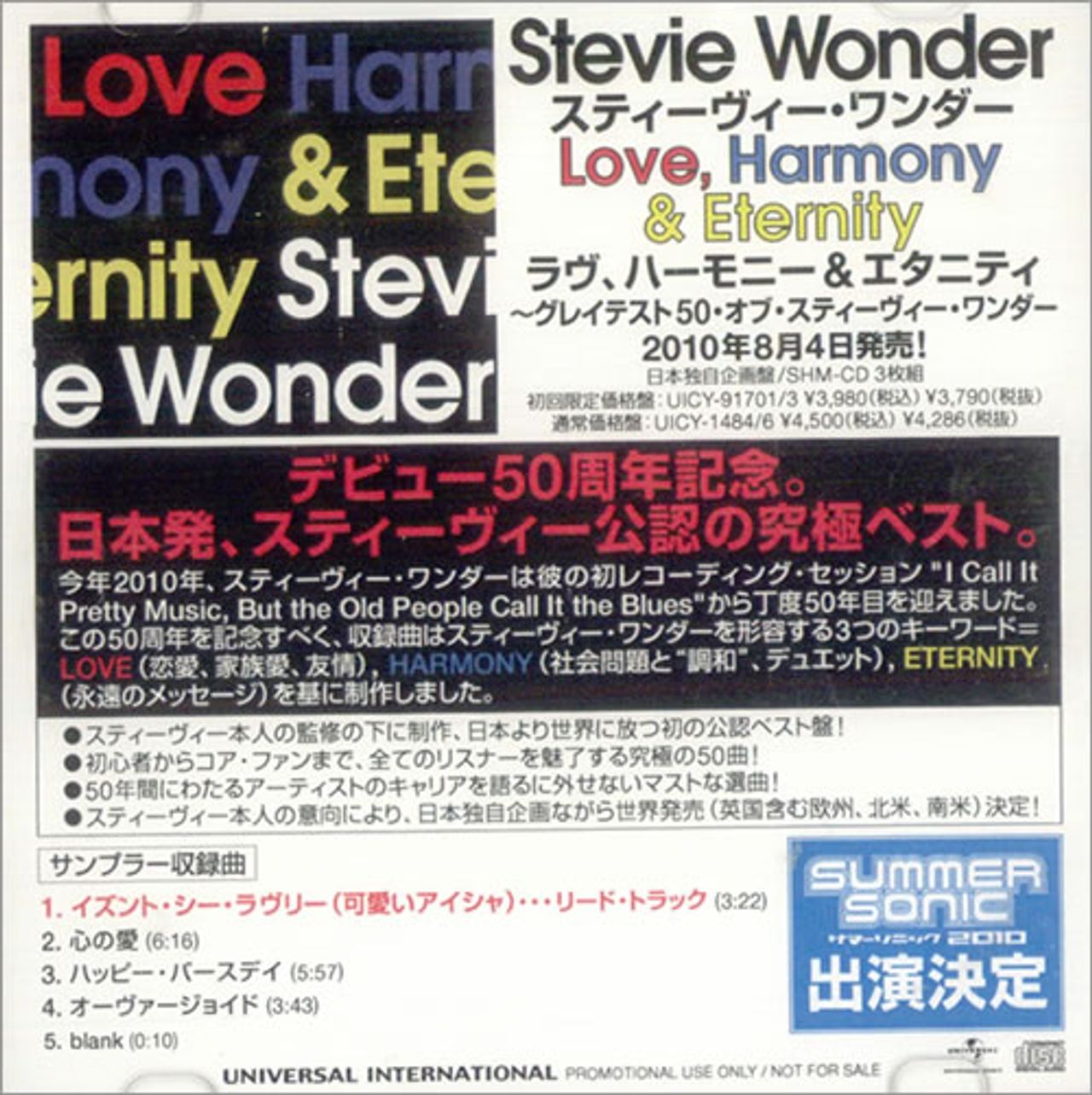 STEVIE WONDER Love, Harmony & Eternity Sampler (Official 2010 Japanese Universal label 4-track promotional only CD-R acetate album sampler for the Japanese only three disc SHM-CD set, includes Isn't She Lovely, I Just Called To Say I Love You, Happy Birthday and Overjoyed . Custom printed disc with title/tracklisting details and custom picture insert with release details and tracklisting with all text in Japanese)