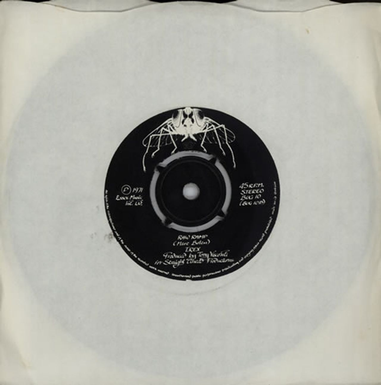 T-REX Get It On (1971 UK 3-track 7" vinyl single with intact four prong centre, also including There Was A Time and Raw Ramp, plain die-cut paper sleeve, the label has a small name annotation but the playing surface remains Excellent BUG10)