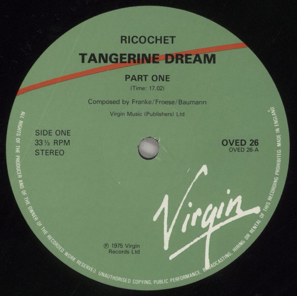 TANGERINE DREAM Ricochet (1984 UK issue of the 1975 LP with red/green Virgin labels, the first live album released by the German electronic pioneers, picture sleeve. The sleeve shows some light edge scuffing, whilst the vinyl looks barely played OVED26)