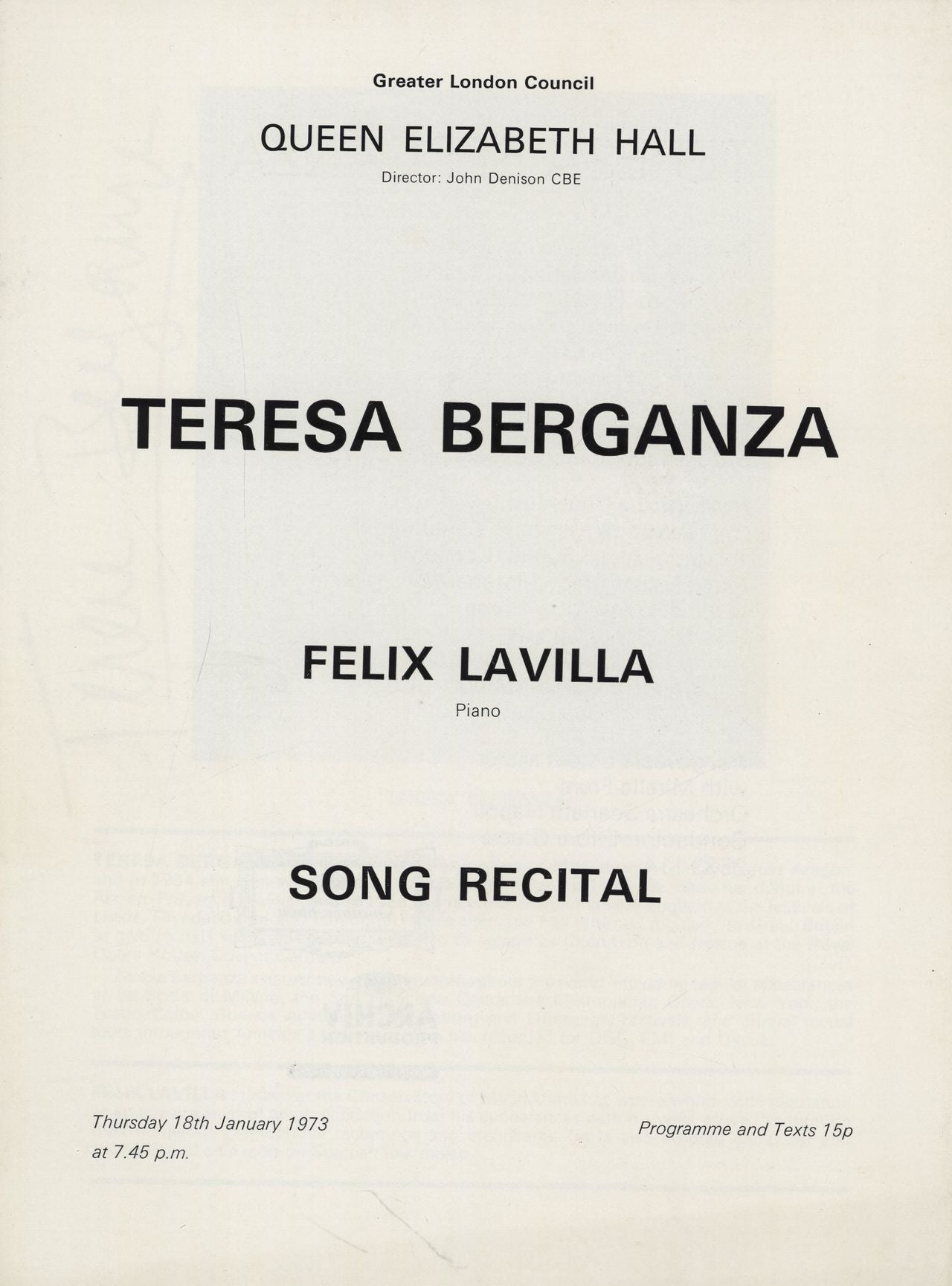 TEREZA BERGANZA Song Recital (1973 UK twelve page programme for the performance at Queen Elizabeth Hall on Thursday 18th January that year. This copy has been nicely AUTOGRAPHED inside in black marker pen)