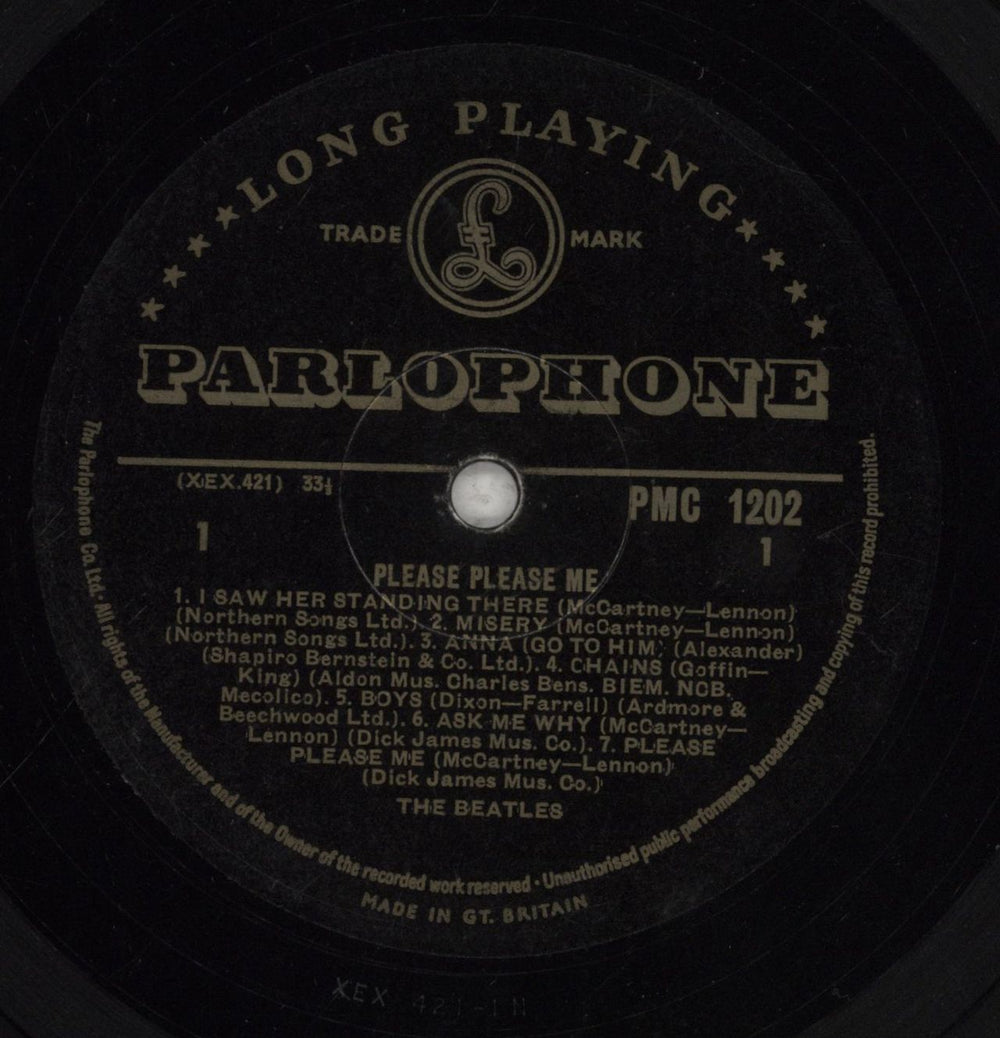 This is the second batch first press with 'Northern Songs Ltd' label publishing credit for the songs I Saw Her Standing There, Misery, Do You Want To Know A Secret & There's A Place, but retains the "Dick James Mus. Co" credit for Please Please Me & Ask Me Why. There is the tax code 'M T' visible by the spindle hole on side 2 of the label.