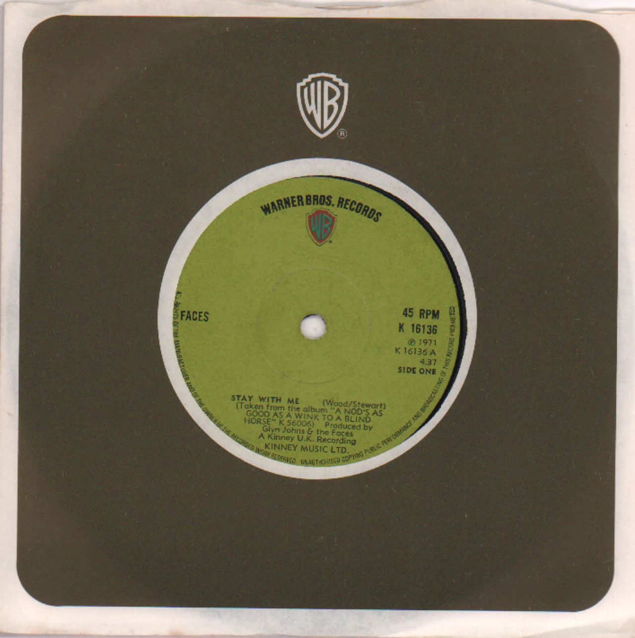 THE FACES Stay With Me (1971 UK solid centre 7" vinyl single, also featuring Debris, Warner Brothers die-cut paper sleeve K16136)