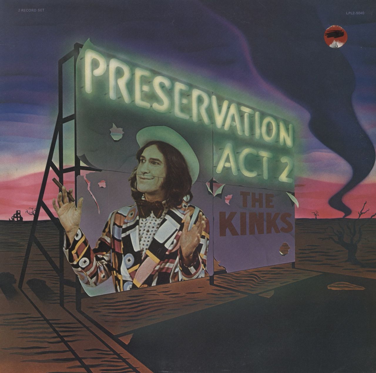 THE KINKS Preservation Act 2 (1974 UK 21-track double LP on the orange RCA label, complete with the fold-out lyric insert, gatefold picture sleeve. The sleeve shows a red record store sticker to the front and has only minimal wear & the vinylis clean & in Excellent condition with little play LPL2-5040)