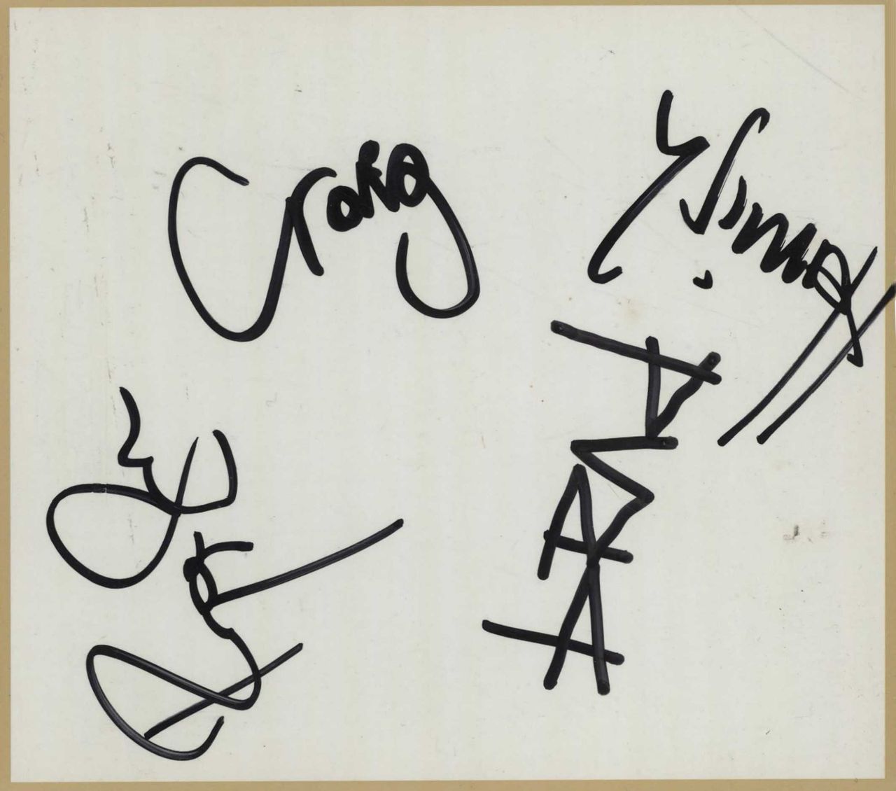 THE VINES Signed Card (Another great find from our Japanese buyer. We have seen signed items like this before but a lot of the time they are usually facsimiles and issued with albums as bonus item, however what we have here has actually been autographed. Measuring approximately 5" x 4½" in size the card has a 'BMG' company imprint and has been fully signed by their 2006-2011 line-up, Craig, Ryan, Hamish and Brad in black marker pen, with a golden border around the edge which frames the signatures nicely)
