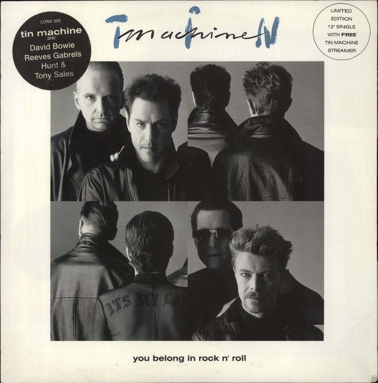 TIN MACHINE You Belong In Rock N' Roll (1991 UK Limited Edition 4-track 12" vinyl single including the Extended Mix & Album Version plus Amlapura [Indonesian Version] and Shakin' All Over. Complete with the bonus 'streamer' - a long fold-out poster with black & white photos of the four band members one side & LONX 305 / London / Victory / Tin Machine logos on the other, the custom stickered picture sleeve has some marks to the front and shows a little edge creasing. The vinyl is Very Good and shows some notable scuffs marks that have no real impact on play. LONX305)