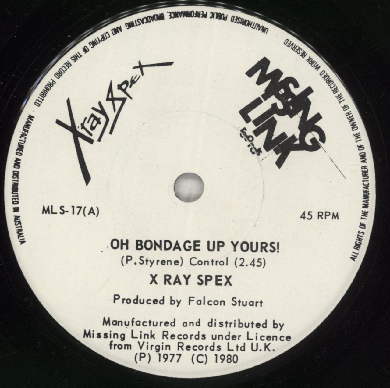 X-RAY SPEX Oh, Bondage! Up Yours! (1980 Australian 7" vinyl single featuring I Am A Cliché. Housed in a plain poly-lined die-cut sleeve. The vinyl is free of any cosmetic scuffing and the labels are free of any spindle wear. A fantastic example! MLS-17)